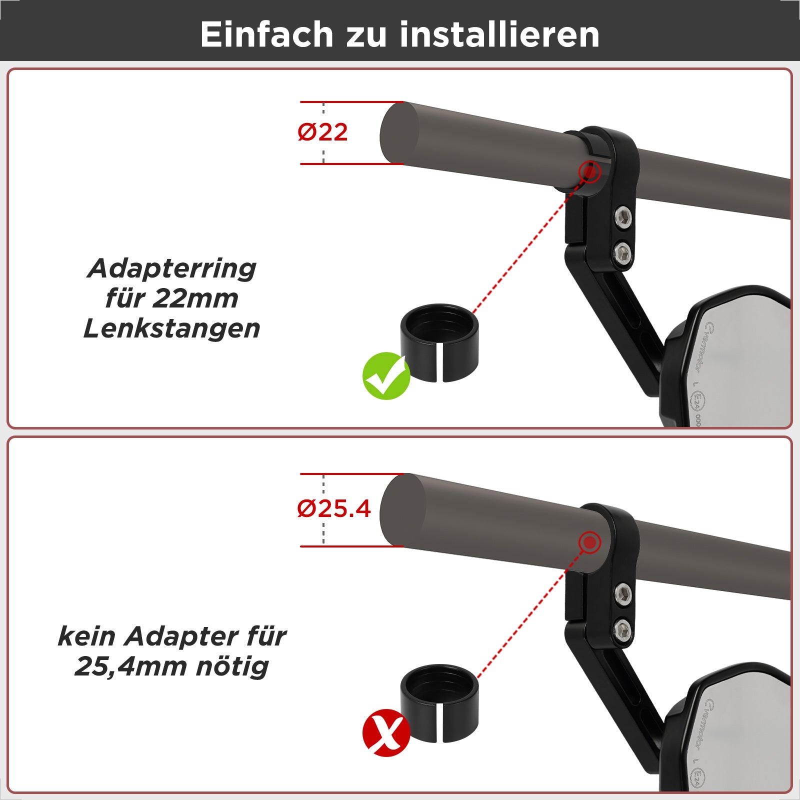 【für 22mm & 25,4mm Lenker】Mitgelieferter Adapterring für 22mm Lenker, 25,4mm Montage ohne Adapter – schnell und sicher montierbar.